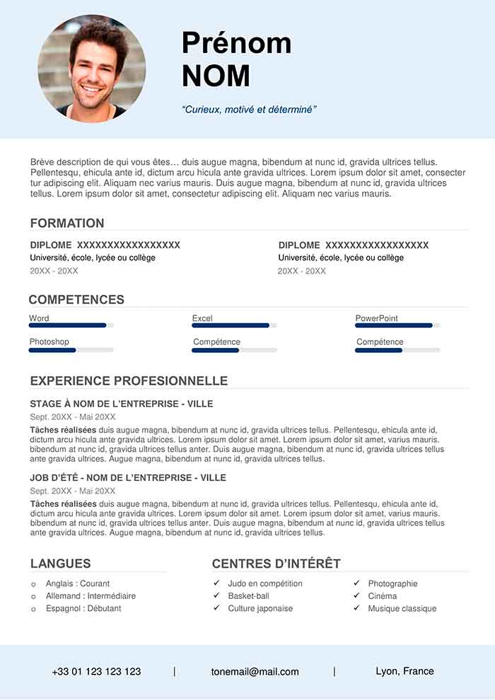 A la recherche d’un CV pour un job étudiant ? Télécharger gratuitement cet exemple de CV parfait pour tout type de job étudiant. Faire un CV pour un job étudiant est toujours quelque chose de compliquer car l’on possède peu d’expérience professionnelle. Dans ce cas-là, n’oublie pas d’ajouter tous les stages et autres petits jobs que tu aurais pu faire. Chaque expérience compte ! Ce modèle de CV Word est gratuit et pleinement modifiable. Prêt à remplir, tu n’auras plus qu’à compléter les différentes sections avec ton information. Si tu as 16 et 17 ans et sans expériences professionnelles, nous te conseillons de supprimer la section « Expériences » et d’étoffer les autres sections tels que « Education », « Centres d’intérêts » ou « Compétences ».